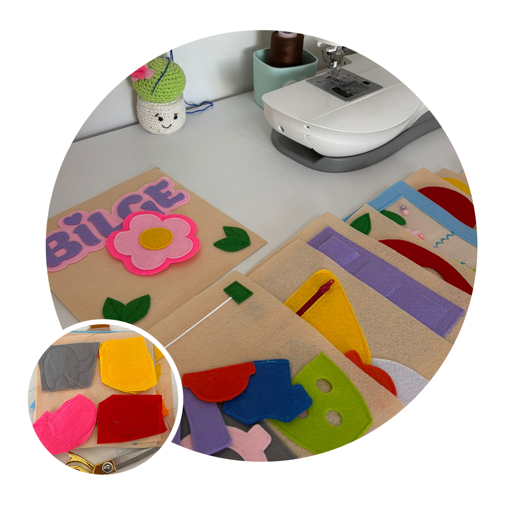 Taşınabilir, kişiselleştirilebilir ve eğitici etkinlik çantalarımız, çocukların gelişim yolculuğuna eşlik eden özel tasarım keçe setlerdir. Her çanta, yaşa uygun içeriklerle dolu, el emeğiyle hazırlanmış ve çocuğun ismine özel olarak kişiselleştirilmiştir. İnce motor becerilerini destekleyen etkinliklerle ekran bağımlılığına alternatif sunarken, her ortamda sessiz oyun alanı yaratır.